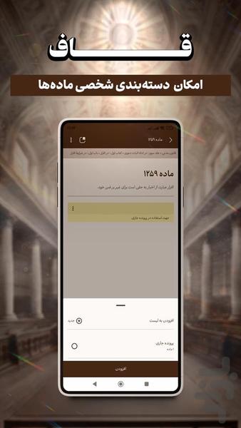 📂 مدیریت قوانین در مجموعههای شخصیسازیشده: با قاف میتوانید قوانین را بر اساس نیاز خود در مجموعههای جداگانه دستهبندی کنید. مثلاً میتوانید یک مجموعه برای قوانین کیفری، یک مجموعه برای حقوق خانواده و یک مجموعه برای قوانین تجاری بسازید. این ویژگی برای وکلا و دانشجویان حقوق که با موضوعات متنوع سر و کار دارند، بسیار کاربردی است.