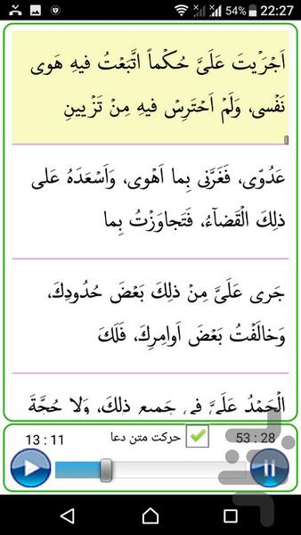 با نصب این برنامه می توانید همزمان با نمایش متن دعای کمیل و حرکت آن با صوت مداحان ، دعای کمیل با نوای چهارمداح مشهور حاج مهدی سماواتی - حاج سید مهدی میرداماد - حاج محمدرضا طاهری و ملاباسم کربلایی را گوش دهید. سعی شده است محیط برنامه جذاب باشد و امکان تغییر فونت و اندازه متن برای کاربر فراهم شده است. در ورژن جدید مشکلات قبلی در تنظیمات برطرف شده است.