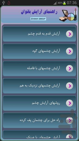 آرايش چشم- انتخاب سايه- خريد لنز- لايه برداري و رنگ آميزي پوست- آرايش لب - انتخاب رنگ خط چشم-انواع مدل ابرو- رژ گونه- از بين بردن موهاي صورت- زيباتر كردن مژه ها- تقويت كننده مو- اكستنشن مو -لاك زدن ناخن- اتوي مو- بند انداختن صورت- افزايش ماندگاري رژ لب-پاك كردن تاتو-عمل تاتو-تست و استفاده از عطر-پاك كردن آرايش-تست لوازم آرايشي-انواع كرم-ماسك هاي خانگي-ريميل زدن