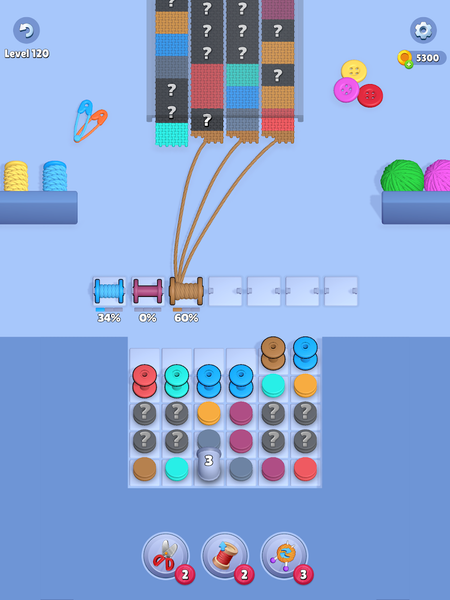 Your challenge is to clear lines of colorful knots from the top, releasing ropes that need to find their matching bobbins below. Strategically choose the right bobbins from the grid to collect the ropes and complete each level.