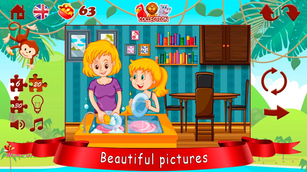 Children will be able to find to game a lot of interesting and will spend time with advantage and pleasure. Having played once, the child will understand that it is very interesting to play puzzles. Especially as our puzzles are created with attention and love of children. In game pictures which will be interesting to children are picked carefully up.