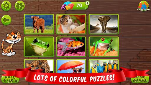 Our puzzle for kids contain pictures of various animals and birds. Bright multi-colored parrots, smiling frogs and even a dog with an umbrella! The gameplay is accompanied by a children's merry melodies and sounds. When the kid collects puzzles correctly, he’s praised: you’re smart, good job, etc.