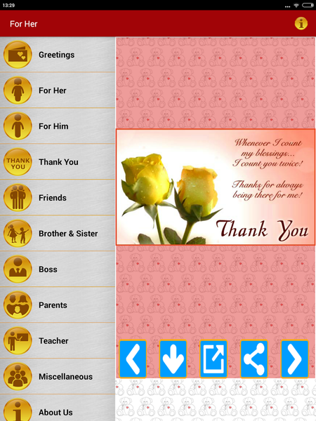 Thank You Greeting Card Images is a free android app all you need to say thanks for things big and small. Browse our collection of Thank You eCards personalized messages and send greeting cards to anyone in just single Tap from your mobile phone.