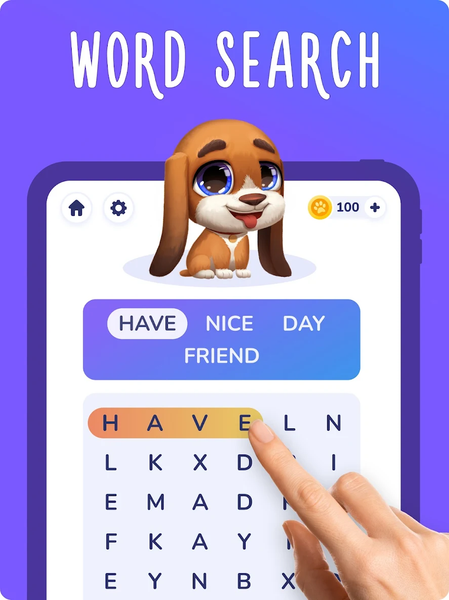 - Adorable Pet: An adorable dog that you must feed by finding words marked with dice. Your furry friend adds a delightful twist to classic word search gameplay.