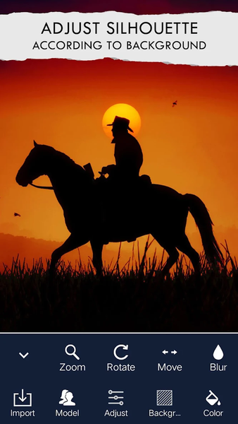 Silhouette maker allows you to create a silhouette of your photo. You can make a silhouette of man, woman, girl, tree, bird, palm tree, dog, wolf, deer, other animals, and objects with this easy to use silhouette creator app. Design your custom Silhouette and share it with all. Silhouette Maker is the best tool for creating an eye-catching Silhouette poster. Just import your pic and Silhouette Maker will automatically convert your photo into Silhouette.