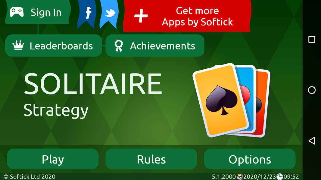 Use all the cards to complete the Foundations, build each one in suit from A to K. Move cards from the Stock to the Tableau. Any card may be played to any pile, but cannot be moved once placed. Only Ace can be moved to the Foundation until the Stock is empty. Once all cards are played, cards may be moved to the Foundations