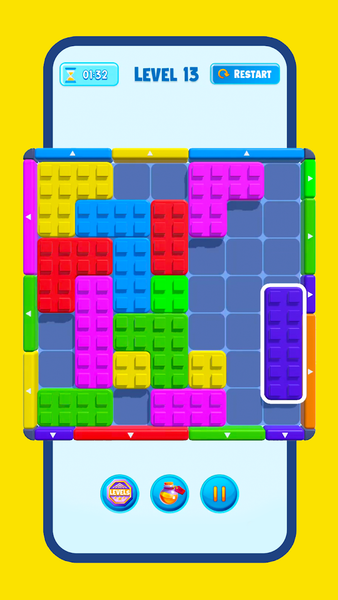 Get ready to rumble in a technicolor explosion of fun with Solve the Puzzle! Prepare to tap, drag, and strategize your way through a kaleidoscope of levels, match blocks to the same color gate and clear out your board! With every win, difficulty will increase and new blocks will be unlocked to test your strategic skills.