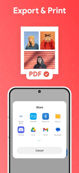 Easily convert JPG to PDF or any photo formats to PDF without internet connection.