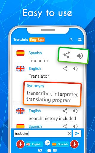 Once you have translated some text you can use the incorporated spanish and english dictionary. You can always check your previous translation in the search history and search for any translation you made. Each translation can be share to other apps: You can share text or audio of all your translations.