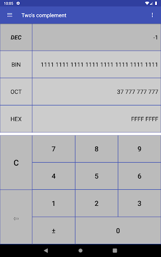 • Two's complement with binary, octal, decimal, and hexadecimal numbers. For each number system a specific keyboard is used, which makes it very easy and fast to use. The values can be copied/paste.