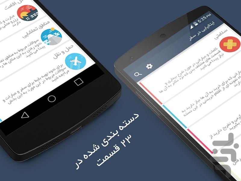 زبان ایتالیایی را به صورت کاربردی بیاموزید. آموزش های زیادی برای زبان ایتالیایی وجود دارد اما یادگیری از پایه نیاز به زمان زیادی دارد از این رو این برنامه مجموعه ای از 750 عبارت و کلمه پر کاربرد زبان ایتالیایی را گردهم آورده تا بدون صرف زمان زیادی بتوانید به این زبان صحبت کنید و کار خود را پیش ببرید. این عبارات در 23 قسمت جدا دسته بندی شده اند و هر قسمت شامل دسته بندی های عبارات، کلمات پرکاربرد و ... می باشد. تمامی عبارات دارای تلفظ انسانی صحیح و با کیفیت بوده و کاربر نیز می تواند برای هر عبارت صدای خود را ضبط نموده و آن را با تلفظ صحیح مقایسه نماید. همچنین امکان برگزیدن عبارات و مشاهده همه عبارات برگزیده شده در یک قسمت وجود دارد. امکان ارسال و اشتراک گذاری عبارات در مسنجر ها و شبکه های اجتماعی و ایمیل نیز وجود دارد.