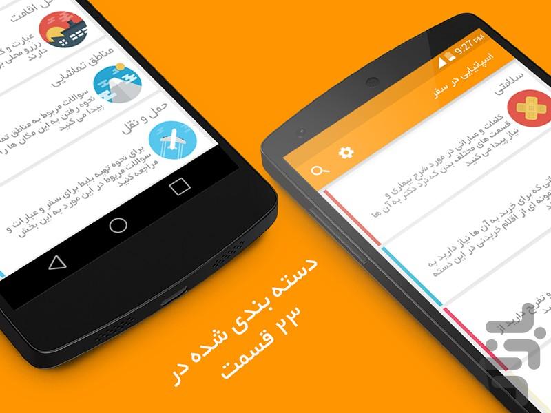 دسته بندی ها: جملات متدوال، برخورد ها، عاشقانه، خوردنی ها، اورژانسی، سلامتی و پزشکی، خرید و بازار، تفریح و سرگرمی، مکان ها، مسیریابی، رانندگی و علائم راهنمایی، محل اقامت، مناطق تماشایی، حمل و نقل، تاریخ، اعداد، حیوانات، زمان، آب و هوا، میوه ها، تحصیلات، مشاغل