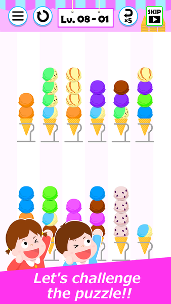 There are various sort games such as ball sort puzzle ,water sort puzzle, hoop sort puzzle・・・,etc. But this time the theme is "ice cream"! Let's match colorful ice cream of the same color! The rules are simple, but you will rack your brain. Enjoy this sorting puzzle game!