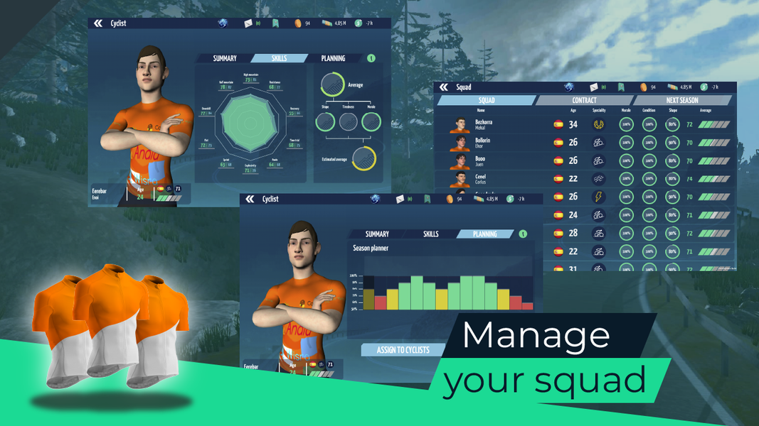 Hire the best cyclists, trainers, physiologists, mechanics... Control the finances and manage the club of your dreams. Overcome all the setbacks that come your way throughout the season.