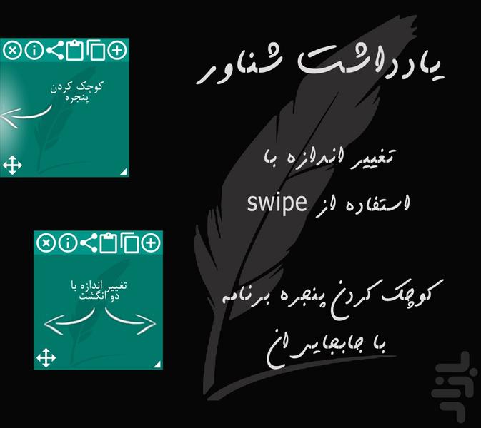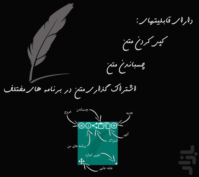 یادداشت شناور برنامه ای برای یادداشت کردن واشتراک گذاری متون مختلف در برنامه های در حال اجرا ,متنهای مختلف رو از برنامهای دیگه کپی کنیدو تواین برنامه بچسبونید.بعداز اون میتونید با دکمه اشتراک گذاری متن خودتون رو پیامک کنید,تو واتساپ ,تلگرام ,بیتالک و... یا هر برنامه ای که متن خودتون رو نیاز دارید ,بفرستید.