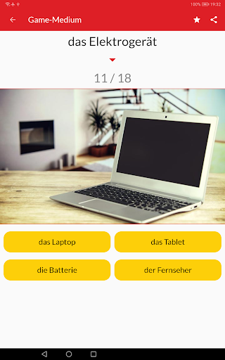 • Game Medium: One random picture from the selected category is displayed and the user is asked to select the correct German word from four options.