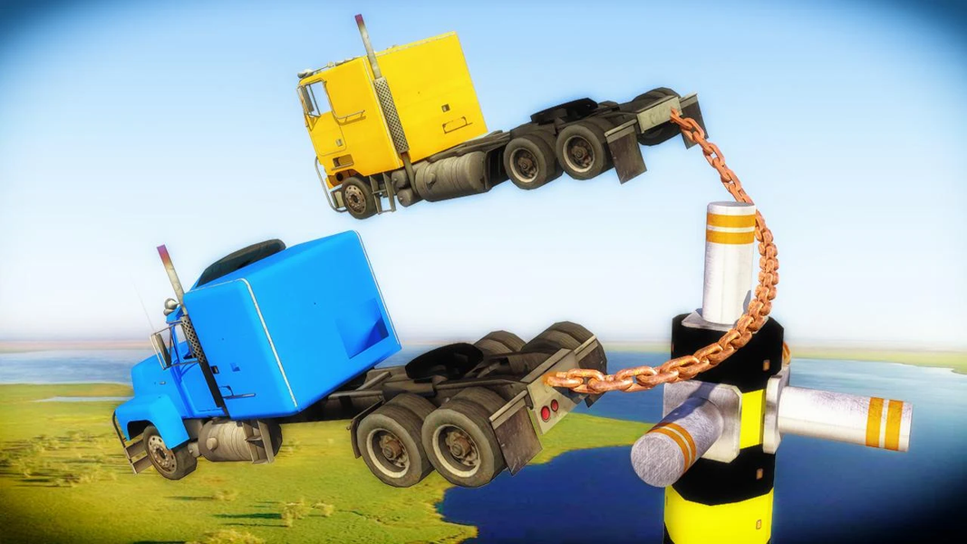 Chained Trucks against Ramp - is a awesome truck destroying game in which you can chain two trucks together and race them and then split them into pieces.