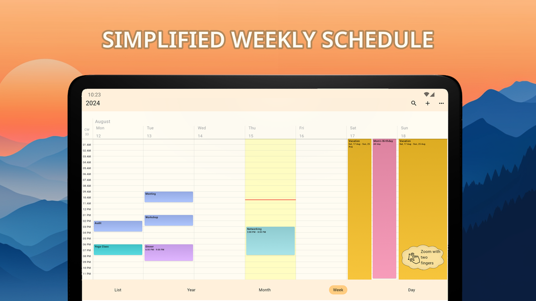 • Multiple View Modes: Seamlessly switch between different calendar views—Year, Month, Week, Day, and List. Whether you need a broad overview or a detailed day-by-day plan, the app has you covered.