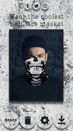 Give your pics a virtual makeover in the 'half face' photo editor! Download the 'mask' face maker, upload a photo or take a new one with the selfie camera, and choose from 'cagoule ghost scary masks'. No matter whether you are a boy or a girl, this halloween photo editor has got everything you need. Wear a cool cagoule mask in every selfie you take! Find an old pic of you and your friend, add 'halloween makeup', and save the 'ninja' photo montage to your device. Play with 'face stickers' for girls all day long! Keep up with the latest trends thanks to the 'Ghost Mask Photo Editor'. Discover an incredible windproof half face skull mask neck cover scarf for motocycle ski snowboard winter outdoor sports. This half face changer will make wonders for your images. Modify photos with the help of the scary mask photo editor horror. Expect to find all kinds of face stickers for pics in the half face photo maker - 'ghost' face filter, halloween masks for adults, cagoule mask men, halloween photo effects, mask for mouth... You can have a half skull face in no time! All you have to do is pick your favorite mouth mask filters and your ghost face is ready!