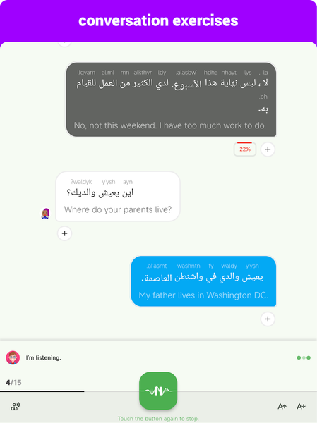 Our step-by-step learning process has been designed to provide users with a better understanding of the Arabic language. You can touch any word to learn its meaning, and expand your vocabulary in no time.