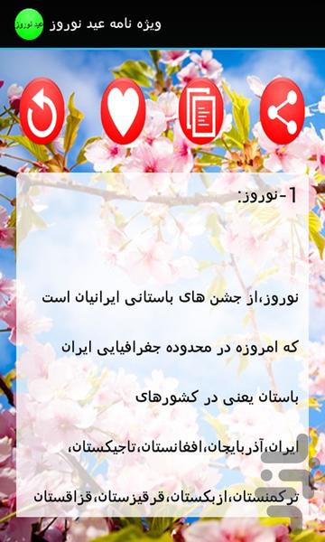 این نرم افزار شامل تاریخچه عید نوروز و عمو نوروز و اشعار نوروزی و طنز نوروزی و پیامک و عکس می باشد.
