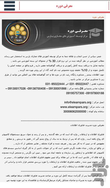 نرم افزار دوره آموزشی مدیریت فناوری اطلاعات یکی از مجموعه نرم افزارهای رایگان آموزشی ارائه شده توسط مرکز توسعه آموزش های مجازی پارس بوده و حاوی محتوای آموزشی پیرامون این دوره می باشد .