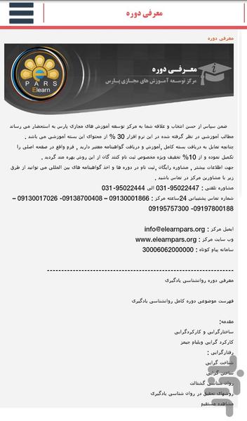 نرم افزار دوره آموزشی روانشناسی یادگیری یکی از مجموعه نرم افزارهای رایگان آموزشی ارائه شده توسط مرکز توسعه آموزش های مجازی پارس می باشد، این مرکز با اخذ مجوزات لازم ، برگزار کننده آموزش های مناسب با بستر الکترونیکی در بیش از 250 دوره آموزشی در رشته های مدیریت ، کامپیوتر، کشاورزی دامپروری و شیلات ، روانشناسی و ... در خدمت هموطنان و فارسی زبانان جهان می باشد. این نرم افزار حاوی 30 % از محتوای کامل آموزشی می باشد که در صورت تمایل می توانید با مراجعه به وب سایت مرکز به آدرس www.elearnpars.org و دریافت بسته کامل و آموزش ، از گواهینامه های معتبر داخلی و بین المللی پایان دوره، اعطایی از مرکز بهره ببرید.
