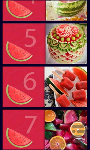 بیشتر عکسها توضیحی لازم ندارن و با دیدن متوجه میشید که باید چیکار کنید تا هندونه ی گرده قرمز شما تبدیل به یه خوردنیه زیبا و رنگین بشه
