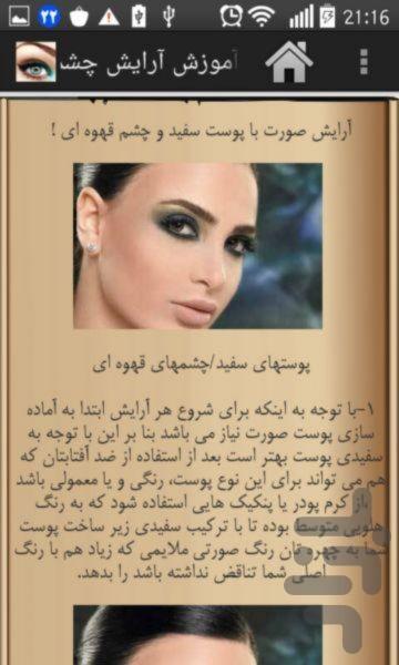 در این برنامه با این فوت و فن آشنا خواهید شد .. ده ها مدل از آرایش چشم رو براتون آموزش خواهیم داد..آموزش هایی به صورت کاملا تصویری قرار داده شده..تا با توجه به حالت چهرتون از این مدل ها در مجالس استفاده کنین..