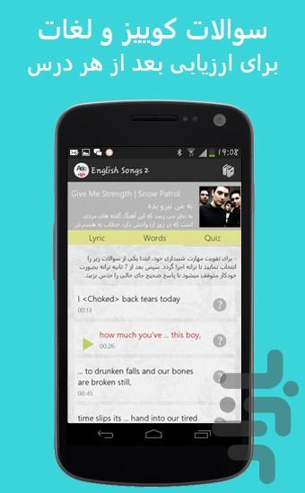 در هر درس یک آهنگ را گوش دهید، متن ترانه را به همراه ترجمه مشاهده کنید. سپس کلمات آن درس را مرور کنید. کلمات مورد نظرتان را به دفترچه لغاتتان اضافه نمایید. در آخر به سوالات کوییز که برای بالا بردن مهارت شنیداری شماست، پاسخ دهید.