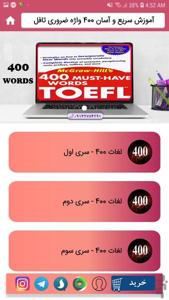 اپلیکیشن اندرویدی آموزش ۴۰۰ واژه ضروری تافل به ساده ترین شکل ممکن به آموزش مجموعه لغات تافل می پردازد. در این برنامه برای هر یک از کلمات ارائه شده، تلفظ صحیح واژگان (phonetic) ، ترجمه مربوط به لغت و مثال، مترادف، اجزای کلام (part of speech) ، و مثال آورده شده است. این اپلیکیشن برای کلیه زبان آموزان به ویژه داوطلبان شرکت در آزمون تافل کمک قابل توجهی خواهد نمود. با استفاده از این اپلیکیشن شما مجموعه ای از مهم ترین لغات تافلی را همراه خود خواهید داشت و با تمرین و تکرار این واژگان به سطح قابل قبولی از واژگان تافل خواهید رسید.