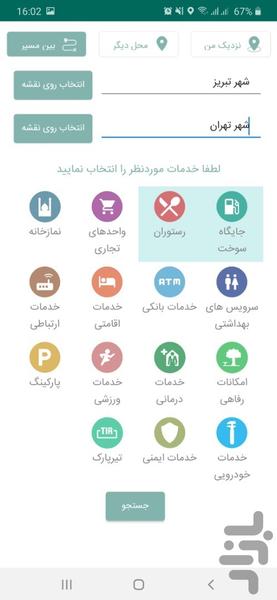 v پیدا کردن مکان خدمات عمومی بین شهری دارای مجوز شامل جایگاههای سوخت، سرویسهای بهداشتی و نمازخانه ها، رستورانها، واحدهای تجاری، خدمات اقامتی، بانکی، خودرویی، درمانی، تیرپارکها و... با امکان تعیین شعاع جستجو یا انتخاب مبداء و مقصد سفر و مشاهده نتایج بر اساس فاصله تا مکان کاربر.