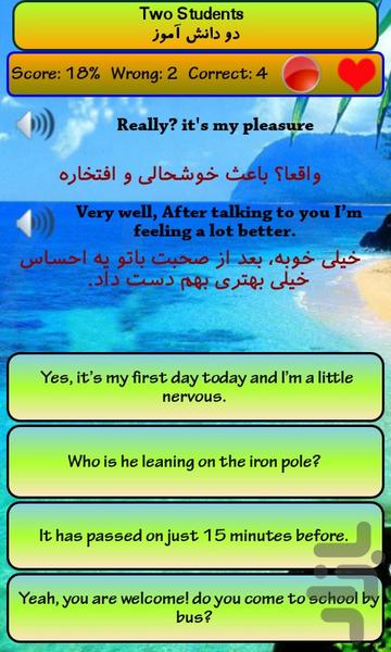 هم زمان با آن متن دیالوگ گفته شده توسط برنامه همراه با ترجمه فارسی آن در قسمت بالای صفحه به نمایش درآمده و در پی آن شما چهار گزینه در پایین صفحه برای جواب مشاهده خواهید کرد.