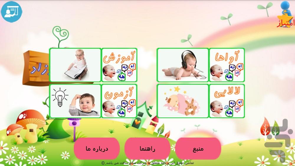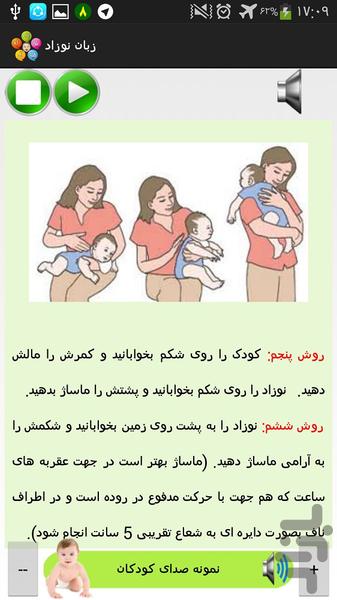 1- بخش آموزش ، در این بخش با آواهای مختلف نوزاد خود آشنا می شوید و علت ایجاد این آواها گفته شده و راه حل مناسب ارائه می گردد.