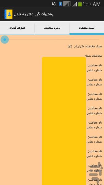 همیشه امکان دارد لیست مخاطبان شما به طور ناگهانی یا از طریق ویروس ها پاک شوند و یا حتی خطای خود شما منجر به از دست رفتن لیست مخاطبان شما شود. داشتن یک بکاپ از دفترچه تلفن می تواند شما را دیگر نگران از دست دادن آن نکند. برنامه حاضر می تواند از مخاطبین شما پشتیبان بگیرد و آن را در حافظه دستگاه ذخیره کند، از دیگر امکانات این برنامه ارسال لیست مخاطبان شما از طریق ایمیل یا شبکه های اجتماعی است، این امکان به شما اجازه می دهد به راحتی لیست مخاطبان تلفن خود را برای شخص دیگری یا حتی خودتان ارسال کنید.