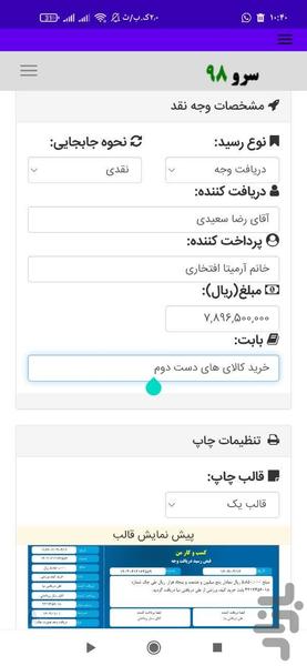 در این برنامه اطلاعات دریافت و پرداخت کننده وجه، مبلغ وجه و غیره را وارد نموده و سپس یک رسید چاپی را صادر نمایید. این رسید را می توانید دانلود کنید، در برنامه های پیامرسان و شبکه های اجتماعی به اشتراک بگذارید و غیره.