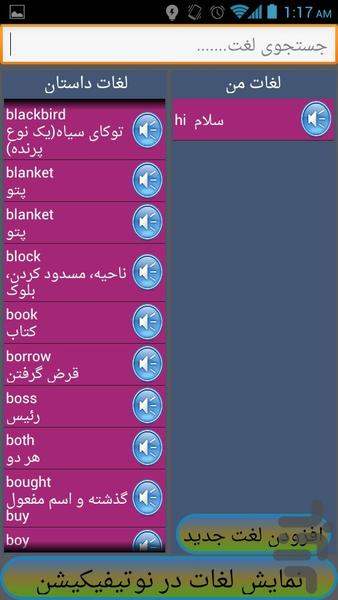 3_امکان ذخیره لغات توسط شما---شما می توانید لغات دیگر داستانها را ترجمه کنید و در برنامه ذخیره نمایید یا می توانید هر لغت انگلیسی که دوست دارید ذخیره کنید.
