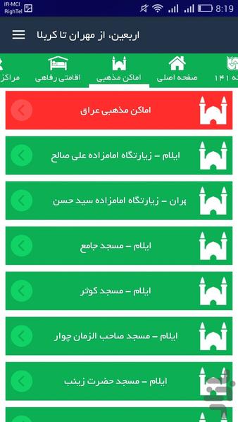 در این قسمت فهرست اماکن مذهبی عراق از نجف تا کربلا و فهرست امامزادگان و مساجد استان ایلام نمایش داده خواهد شد.