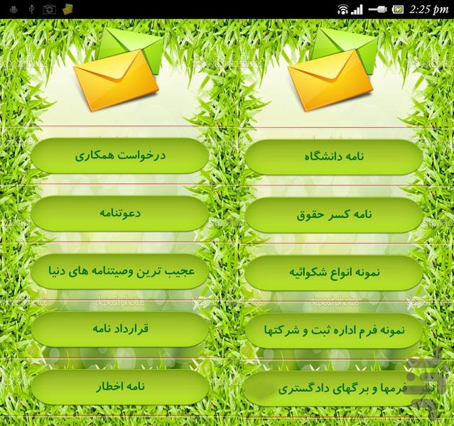 اصول نوشتن یک رزومه، درخواست خوابگاه دانشجویی، وام دانشحویی، تقاضای تقسیط مالیات، درخواست خرید لوازم، درخواست شرح وظایف، درخواست پرداخت اضافه کاری، درخواست تشکیل کلاس درس، نامه استعلام کار، درخواست تسهیلات، درخواست پرداخت بدهی، درخواست مرخصی، درخواست تغییر زمان برگزاری امتحانات، درخواست دسته چک، درخواست وام از بانک، تقاضای اهالی خطاب به شهرداری، درخواست نمایندگی فروش محصولات، درخواست تدریس در دانشگاه، نامه به فرمانداری، تقاضای انتقال محل خدمت، درخواست معافیت از خدمت سربازی، درخواست افزایش حقوق، خاتمه قرارداد و همکاری، نمونه نامه به اداره امور مالیاتی، رزو هتل، متن اظهارنامه، اعلام نرخ بیمه درخواستی، گزارش کلاه برداری و سرقت، انصراف از ادامه تحصیل، اعتراض به نتیجه گزینش، اعتراض به نمره، نحوه شکایت نویسی، شکایت از مامورین کنترل کنتور، تقدیر از استاد یا معلم، تقدیر و تشکر بابت همکاری، گواهی خرید جهیزیه، متن صدور عدم سابقه کیفری، گواهی پایان کار (سابقه کار)، گواهی اشتغال به کار، تقدیرنامه بازنشستگی برای همکار و رئیس، استشهادیه محلی برای گواهینامه، تعویض شناسنامه، درخواست اخذ سند ازدواج، درخواست لوله کشی فاضلاب، حل مشکل تخلف ساخت به شهرداری، خداحافظی به دلیل استعفا، نامه به فرماندار و بخشدا، متن دعوت و شرکت در جلسه، معرفی اعضا، درخواست انتقال خط تلفن، متن استعفانامه ووکالت خرید ماک، وکالت واگذاری سرقفلی، وکالت نامه خرید امتیاز تلفن-آب-برق-گاز، وکالت فروش ملک، وکالت تقسیم اموال مشترک، قرارداد پیش فروش آپارتمان، قرارداد مبایعه نامه های املاک، قرارداد وام مسکن، قرارداد جعاله، اجاره نامه تجاری، وکالت تعویض پلاک خودرو، وکالت خرید و فروش خوردو، قرارداد مبایعه نامه خوردو و موتور سیکلت، قرارداد اجاره به شرط تملیک، قرارداد مضاربه، قرارداد انجام خدمات، قرارداد اعطای نمایندگی، قرارداد استخدام، قرارداد توزیع اتاق بازرگانی، وکالت در طلاق، وکالت سرپرستی فرزند، وکالت پدر برای ازدواج دختر باکره، سند دریافت مهریه، وکالت انتقال و صلح مبایل، سند اقرار و گذشت در پرونده کیفری و ...
