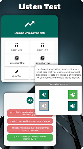 Work through the entire tests and games inside, play and do it again and again, you can see how well you’ve done. You can choose a specific topic to listen, remember and do the relevant exercises or exciting mini-game after that. Practice little and often is definitely the best way to improve your vocabulary.