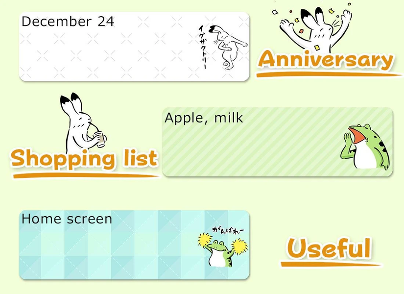 This application is a widget for your home screen and you can enjoy personalizing it. Keep pressing the home screen till an additional menu of widgets appears. Pick out “Sticky Note Da Choju-giga” from a list of widgets.