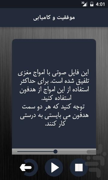 و روش دیگر روش صوتی که عبارات درج شده در اپلیکیشن به همراه یک فایل صوتی محتوی امواج مغزی، موسیقی آرام بخش به صورت صوتی ضبط شده اند و آنرا می توانید مانند یک موسیقی در مسیر یا به هنگام خواب (قبل از خواب) گوش دهید