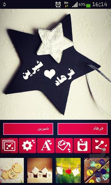 ♡یه عاشقانه اندرویدی♡ رضایت 99% کاربران اتفاقی نیست!!! به عکس های بالا دقت کنید!!! قطعا برای هر کسی دلچسبه که اسم خودشو عشقشو یه جا ببینه ! برنامه "اسمشو بنویس" کاملا (تاکید میکنم کاملا) به صورت هوشمند عمل میکنه. ینی چی؟ ینی فقط کافیه اسم خودتون و عشقتون رو وارد کنید و کلی طراحی و مدل های مختلف اسمتون رو مشاهده کنید و بعد با نرم افزاری که دوست دارید اونو به اشتراک بذارید. حتی میتونید با تنظیمات پیشرفته تر مدل و رنگ دلخواه خودتون رو جایگزین کنید. میتونی فقط اولین حرف اسما رو بنویسی! میتونی اسم رو کامل بنویسی! میتونی فارسی بنویسی ! میتونی لاتین بنویسی. فرقی نمیکنه برنامه اسمشو بنویس فکر همه جاشو کرده.