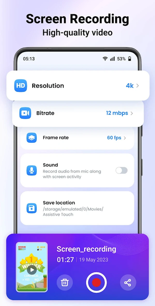 It provides an on-screen floating panel for quick controls, including screen recording, junk file cleanup, opening apps, etc. You can customize the opacity and color of the panel and icon as you like.
