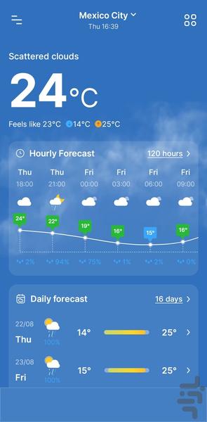 + پیش بینی دقیق ساعتی تا 24 ساعت.