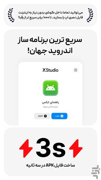 با هسته قدرتمند ایکس استودیو، ساخت فایل APK برنامه در کمتر از چند ثانیه و کاملا آفلاین انجام میشود. میتوانید آن را با امضای اختصاصی خودتان در مارکتهای اندرویدی مانند کافه بازار منتشر کنید.
